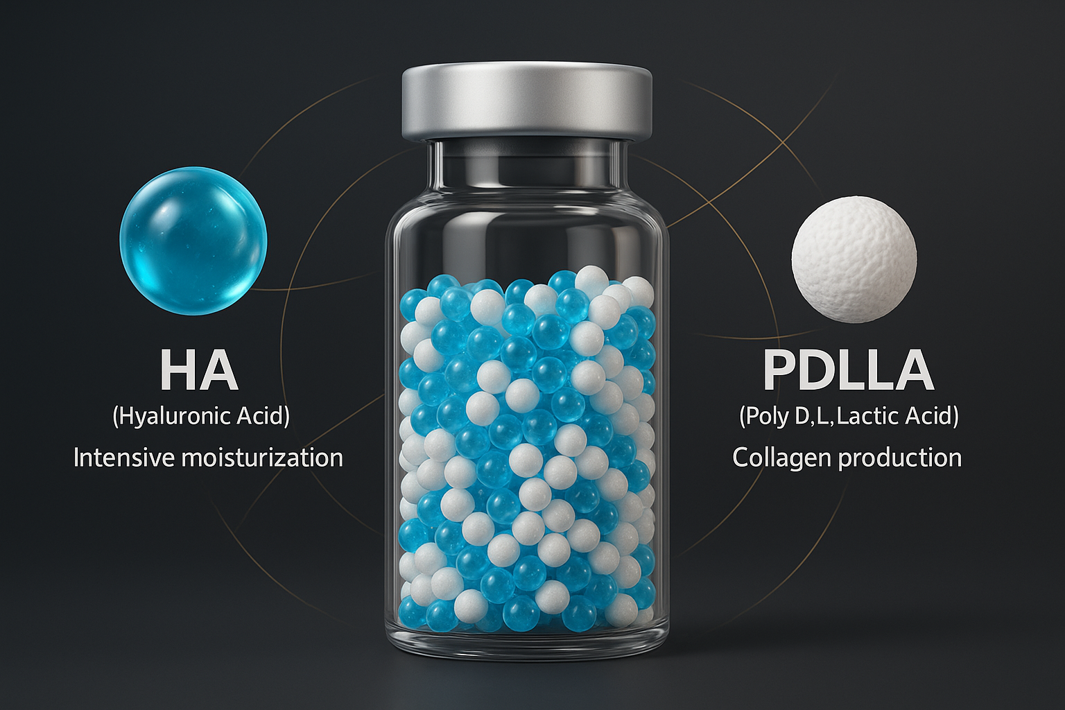 ส่วน PDLLA จะอยู่ในรูปแบบ Microspheres เมื่อฉีดแล้วจะเข้าไปทำหน้าที่เหมือนโครงสร้างตาข่ายก่อนจะกระตุ้นการผลิตคอลลาเจนและเส้นใยต่าง ๆ ซึ่งจะช่วยให้ผิวมีความแข็งแรง อิ่มฟู และแน่นขึ้นค่ะ โดยการทำงานของ PDLLA จะเริ่มให้ผลลัพธ์ในช่วง 2-3 สัปดาห์หลังฉีด และเห็นผลได้ชัดเจนที่สุดหลังจาก 6 เดือนค่ะ